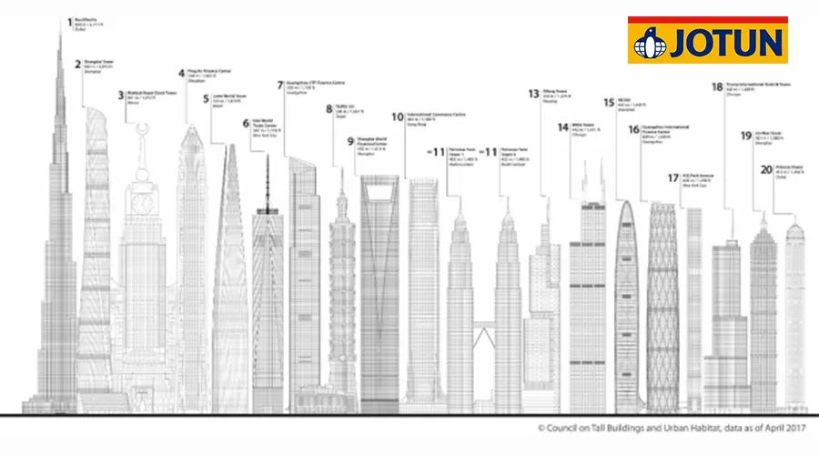 全球排名前20的超高層建筑中有近一半的超高層建筑都使用了佐敦的涂料解決方案。